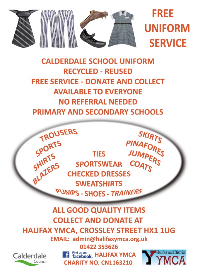 We have uniforms for pre-schoolers, primary and secondary school children. Drop by at our uniform shop on Halifax, The Marlborough Hall, 13 Crossley St, Halifax HX1 1UG (same building as the Roller Skating venue, two doors down from our Charity Shop).