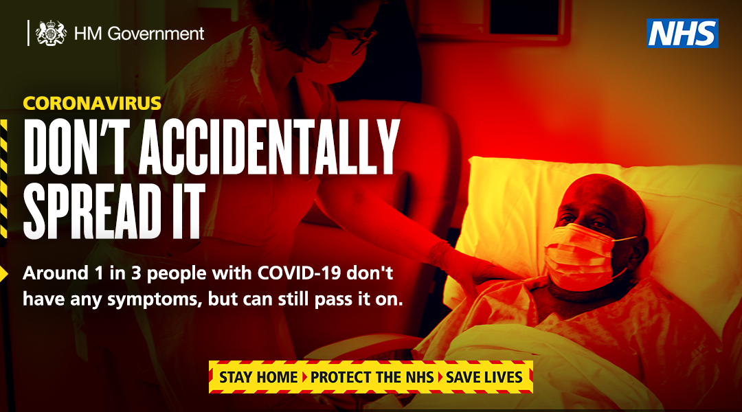 You could be spreading coronavirus without knowing it. Around 1 in 3 people with COVID-19 don’t have any symptoms, but can still pass it on. Stay home. Protect the NHS. Save lives. For more information, go to http://gov.uk/coronavirus