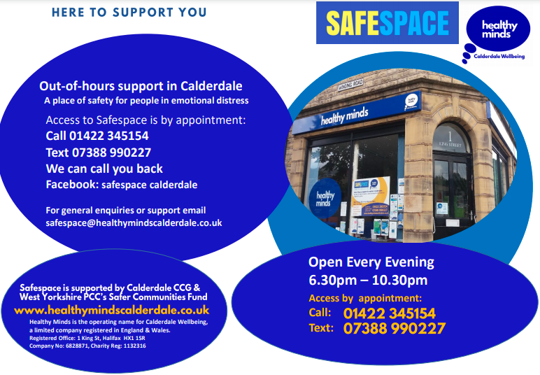 For general enquiries or support, email safespace@healthymindscalderdale.co.uk