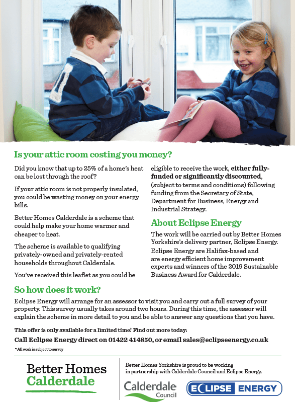 Up to 25% of a home’s heat can be lost through the roof and if your attic room is not properly insulated, you could be wasting money on your energy bills. Following a successful application process, Calderdale Council will receive over £2million from the Government’s Secretary of State for Business, Energy and Industrial Strategy’s Green Homes Grant Local Authority Delivery Scheme, to help improve the energy efficiency of low-income households (up to £30k household income or means tested benefits). The funding will be used to support residents living in the least energy efficient homes to make residents’ homes healthier, warmer and cheaper to heat as well as helping to reduce carbon emissions and tackle the climate emergency.