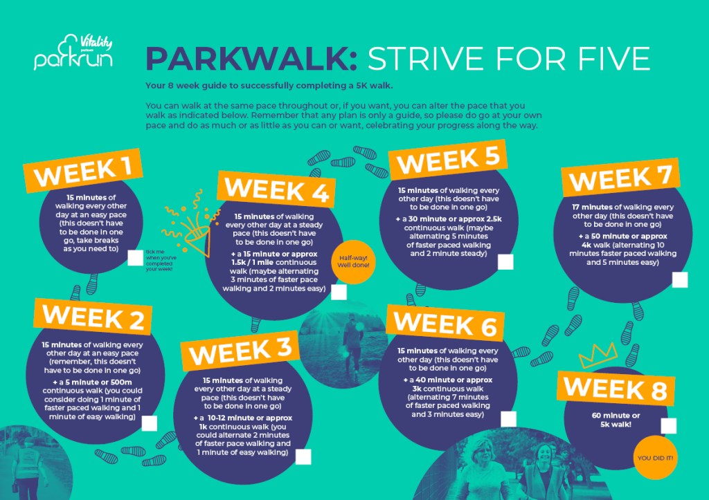 If you’re ready for a new challenge, @parkrunUK have created this eight-week guide to completing a 5k walk. This is a guide, so go at your own pace and do as much or as little as you can or want. You can even print out this guide and tick each week as you go.