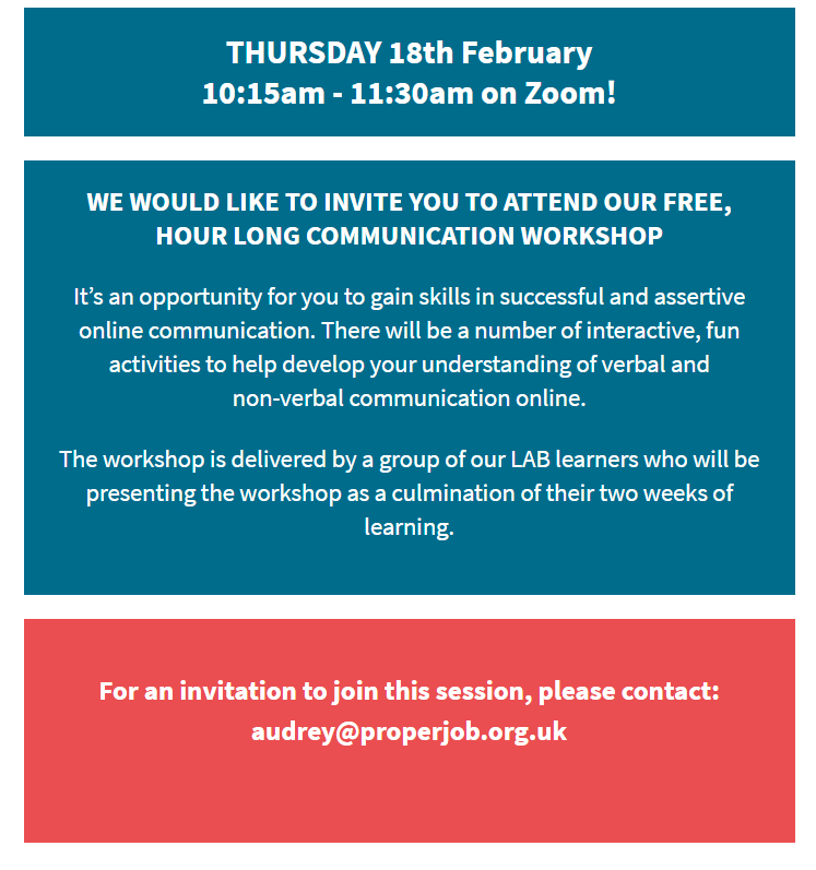 Do your online communication skills need a little help? Proper Job Theatre Co are running an online workshop on Thursday 18 February . Contact Audrey@properjob.org.uk