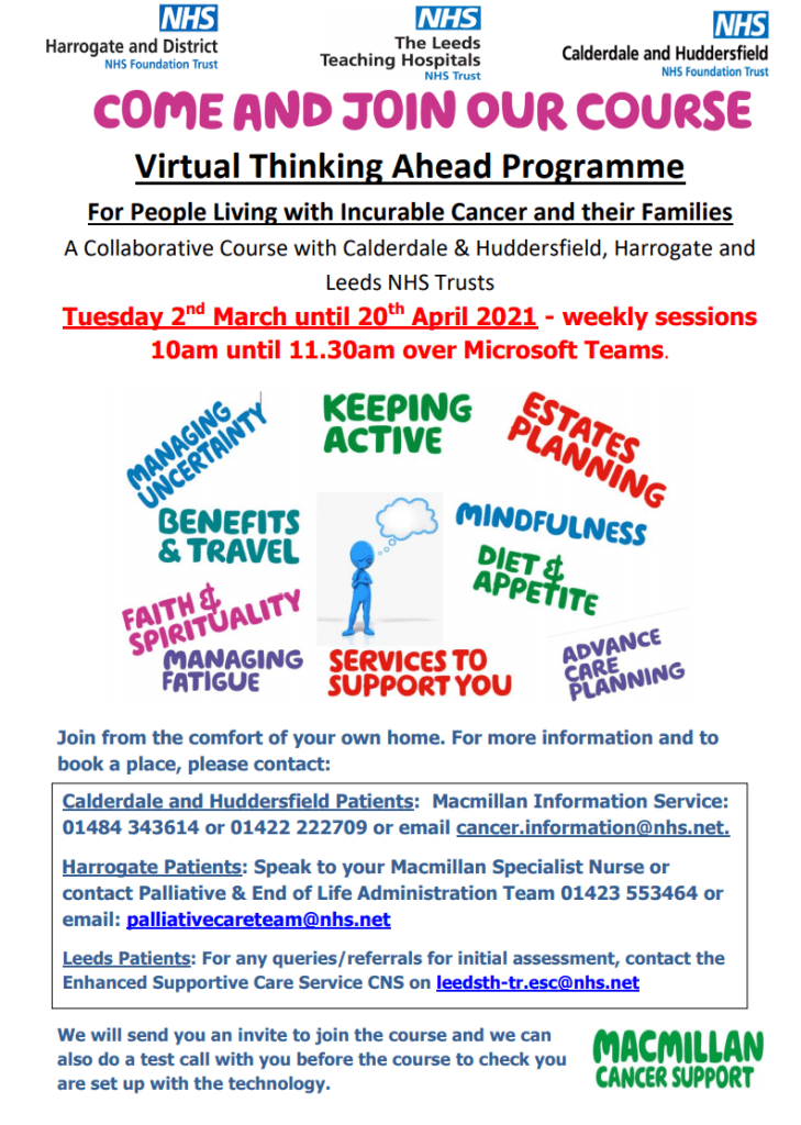 Thinking Ahead is a Health and Wellbeing Programme for patients living with incurable cancer, who may or may not be receiving treatment, as well as their family members.