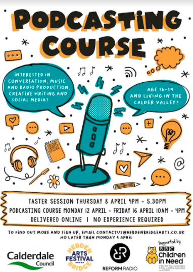 Hebden Bridge Arts Festival are offering a Free Podcasting Course for 16-19 year olds living in the Calder Valley who would like to upskill in digital communication. We’re especially looking for young people’s voices that might be under-represented.