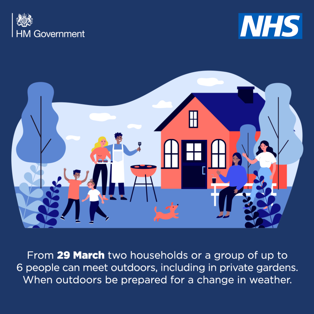 Roadmap out of Lockdown March 30, 2021 / helloitssarahdyer From Monday two households or a group of 6 people people can meet outdoors, please follow the guidelines, #HandsFaceSpace Share this: Click to share on Facebook (Opens in new window) Facebook Click to share on X (Opens in new window) X Click to email a link to a friend (Opens in new window) Email Click to print (Opens in new window) Print Click to share on Pinterest (Opens in new window) Pinterest Click to share on LinkedIn (Opens in new window) LinkedIn Click to share on WhatsApp (Opens in new window) WhatsApp Like Loading...