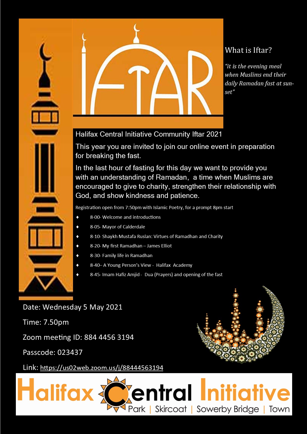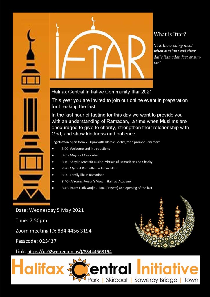 To celebrate our hope for the future and our togetherness as a community we would like to invite you to our online Community Iftar on Wednesday 5 May 2021 starting at 7.50pm.