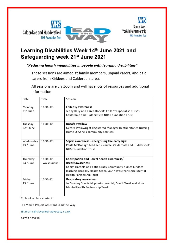 Leaning Disabilities Week 14 June & Safeguarding Week 21 June May 31, 2021May 18, 2021 / helloitssarahdyer “Reducing health inequalities in people with learning disabilities” These sessions are aimed at family members, unpaid carers and paid carers from Kirklees and Calderdale areas. Share this: Click to share on Facebook (Opens in new window) Facebook Click to share on X (Opens in new window) X Click to email a link to a friend (Opens in new window) Email Click to print (Opens in new window) Print Click to share on Pinterest (Opens in new window) Pinterest Click to share on LinkedIn (Opens in new window) LinkedIn Click to share on WhatsApp (Opens in new window) WhatsApp Like Loading...