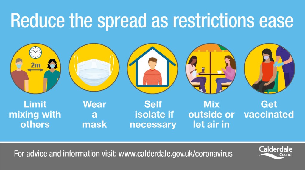 The Council is urging people to be vigilant, take extra care and follow the public health advice as they go about their day-to-day business. Everyone in Calderdale is encouraged to keep doing the five big things to help protect themselves and others from COVID-19: