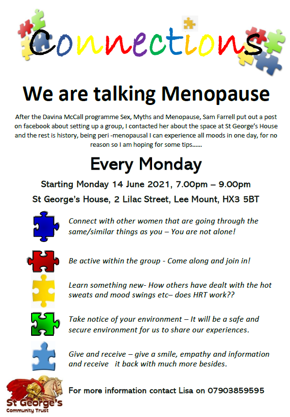 After the Davina McCall programme Sex, Myths and Menopause, Sam Farrell put out a post on facebook about setting up a group, I contacted her about the space at St George’s House and the rest is history, being peri -menopausal I can experience all moods in one day, for no reason so I am hoping for some tips……