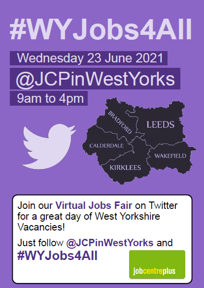 West Yorkshire Virtual Jobs Fair June 15, 2021 / helloitssarahdyer The first virtual jobs fair organised by Job centre plus, 23 June 9am to 4pm. Share this: Click to share on Facebook (Opens in new window) Facebook Click to share on X (Opens in new window) X Click to email a link to a friend (Opens in new window) Email Click to print (Opens in new window) Print Click to share on Pinterest (Opens in new window) Pinterest Click to share on LinkedIn (Opens in new window) LinkedIn Click to share on WhatsApp (Opens in new window) WhatsApp Like Loading...