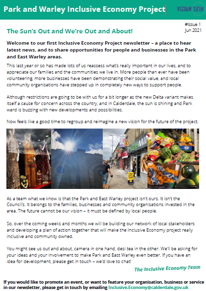 Inclusive Economy Newsletter June 17, 2021 / helloitssarahdyer The first newsletter from the Park and Warley Inclusive Economy team is out now. You can download the full newsletter here Share this: Click to share on Facebook (Opens in new window) Facebook Click to share on X (Opens in new window) X Click to email a link to a friend (Opens in new window) Email Click to print (Opens in new window) Print Click to share on Pinterest (Opens in new window) Pinterest Click to share on LinkedIn (Opens in new window) LinkedIn Click to share on WhatsApp (Opens in new window) WhatsApp Like Loading...