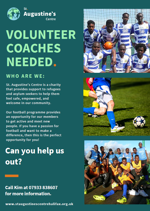 Volunteer Coaches Needed. July 15, 2021July 15, 2021 / helloitssarahdyer St Augustine’s Centre is looking for volunteer football coaches, can you help? For more information visit www.staugustinescentrehalifax.org Share this: Click to share on Facebook (Opens in new window) Facebook Click to share on X (Opens in new window) X Click to email a link to a friend (Opens in new window) Email Click to print (Opens in new window) Print Click to share on Pinterest (Opens in new window) Pinterest Click to share on LinkedIn (Opens in new window) LinkedIn Click to share on WhatsApp (Opens in new window) WhatsApp Like Loading...