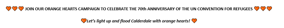 Can you take photographs or videos of you and an 🧡 orange heart 🧡 at local Calderdale landmarks? Or feature the 🧡 orange heart 🧡 in some other creative way and take lots of photos that we can share? On walks, at work, in your home – ANYWHERE! You can create your own 🧡 orange heart 🧡or you can print one from this folder. Be sure to share your activities on social media using the hashtag #TogetherWithRefugees. You might also want to write a quote or a pledge on your 🧡 orange heart 🧡.