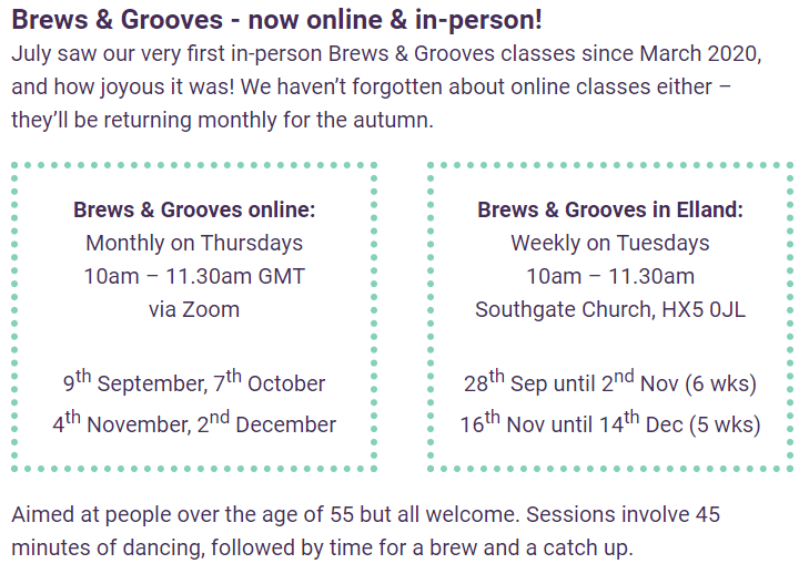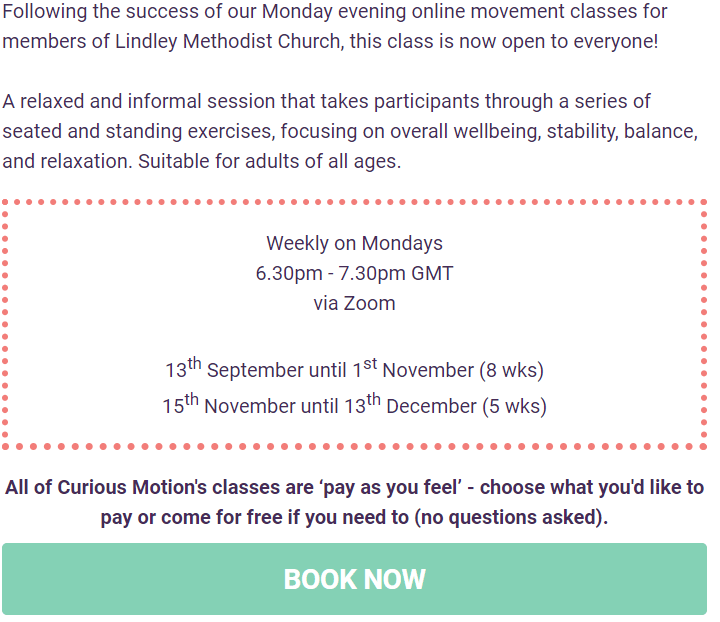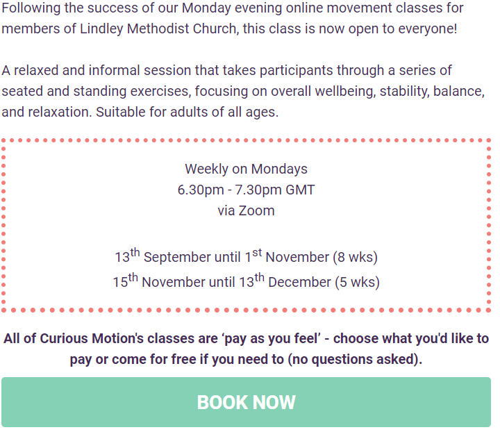 We’re excited to announce that from September we’ll be offering a programme of both in-person and online dance and movement classes. Booking is OPEN!