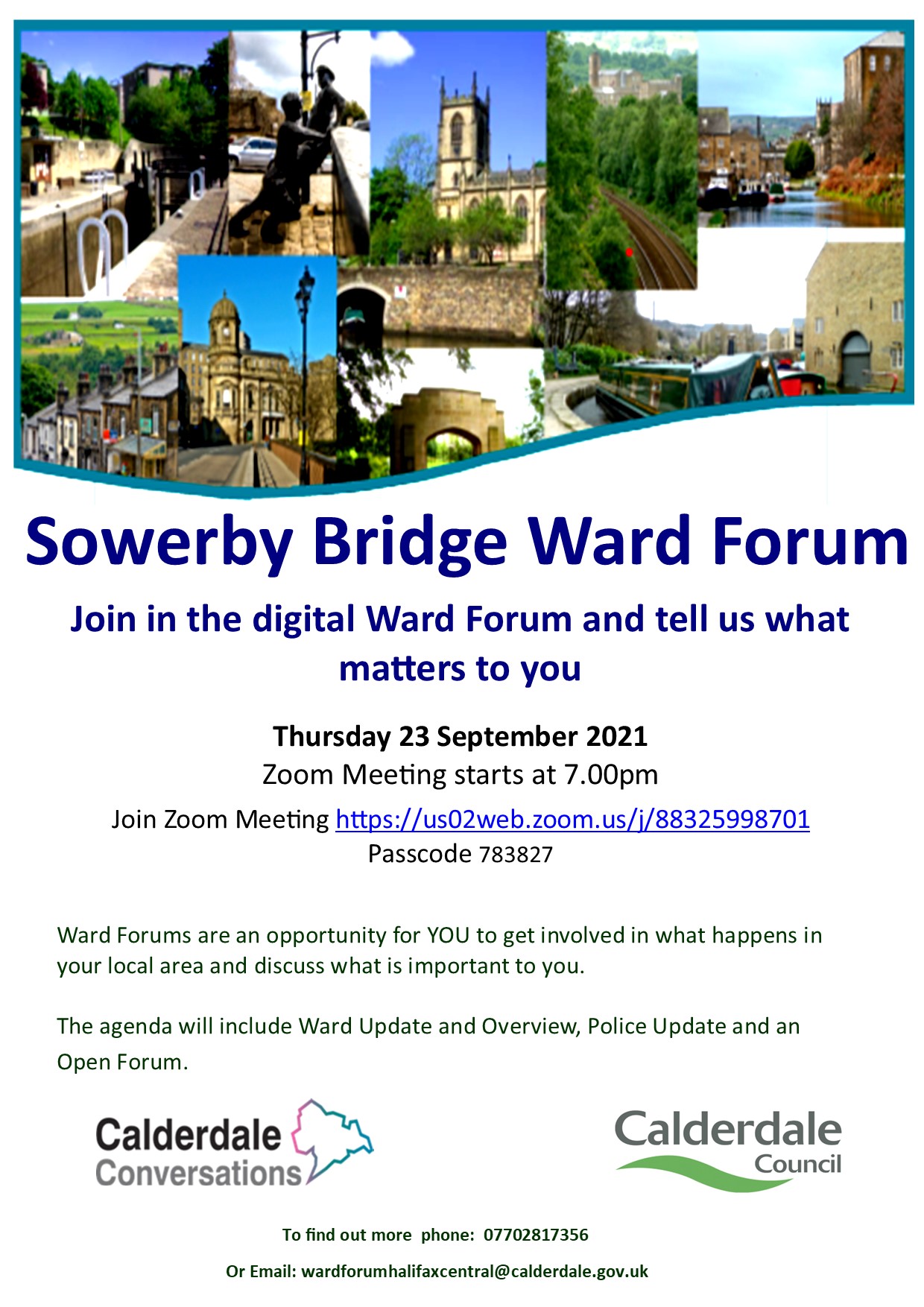 The next Sowerby Bridge Ward Forum will be on Thursday 23 September via Zoom.