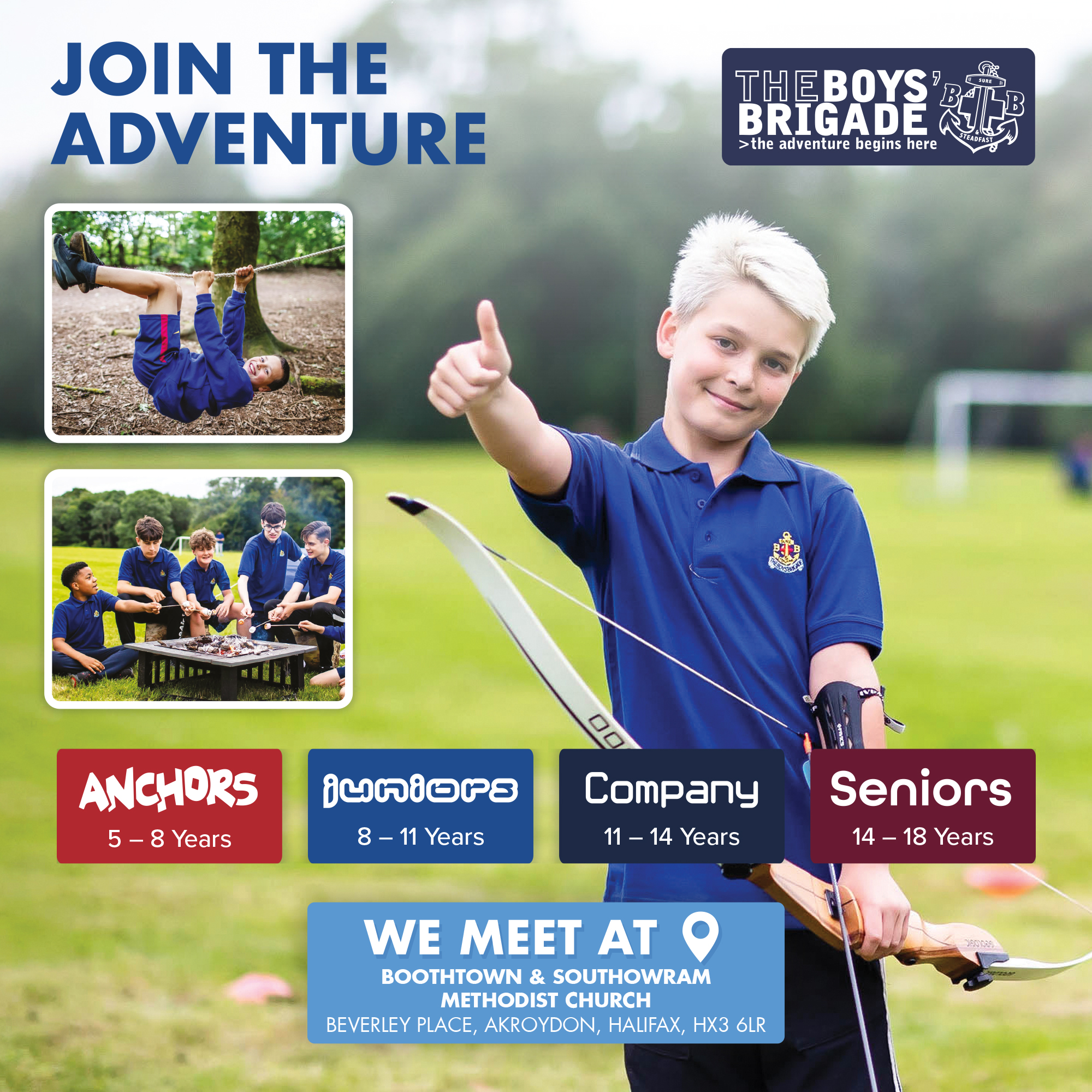 The Halifax branch of the Boy’s Brigade is looking to recruit both boys and adult volunteers. Find more information via our Facebook and Instagram accounts or via the national website (https://boys-brigade.org.uk/