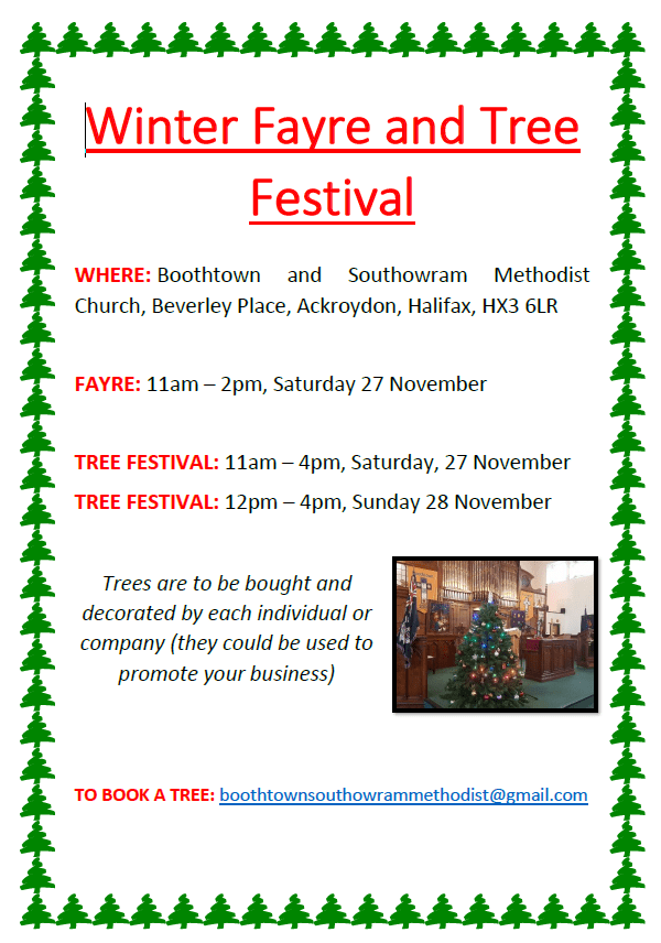 To book tree email boothtownsouthowrammethodist@gmail.com