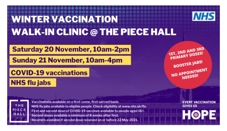 There is a unique opportunity to receive your Covid-19 jab and the NHS flu jab this weekend at the Piece Hall. No appointment needed and all three doses (1st, 2nd and booster) will be available!