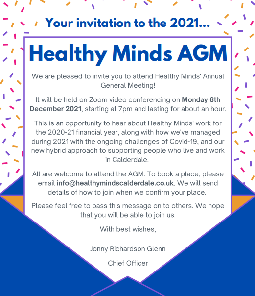 All are welcome to attend the AGM. To book a place, please email info@healthymindscalderdale.co.uk. We will send details of how to join when we confirm your place.