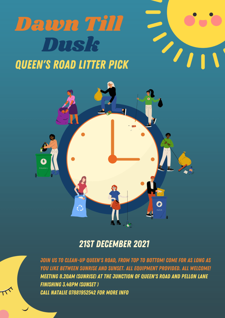 In spirit of the season and to mark the shortest day of the year, North Halifax Partnership want to give thanks to our community, our planet and our home. We are organising a community litter pick on Tuesday 21st December 2021 starting at 8.20 am (sunrise) and finishing 3.48 pm (sunset), meeting at the junction of Queens Road and Pellon Lane to clean Queens Road top to bottom! We would be delighted if you could come along, for the whole thing or as long as you want. We will have all the equipment you’ll need so just turn up – we’ll be somewhere along Queens Road and its side streets! COVID safety precautions will be adhered to.