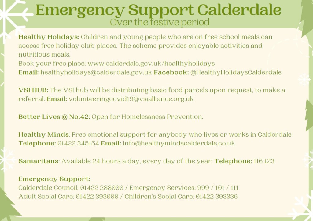 Emergency support, including food parcels, is available from 20th December to 1st January 2021.