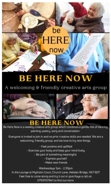 Be Here Now is a creative arts group which combines a gentle mix of dancing, painting, poetry, song and conversation.