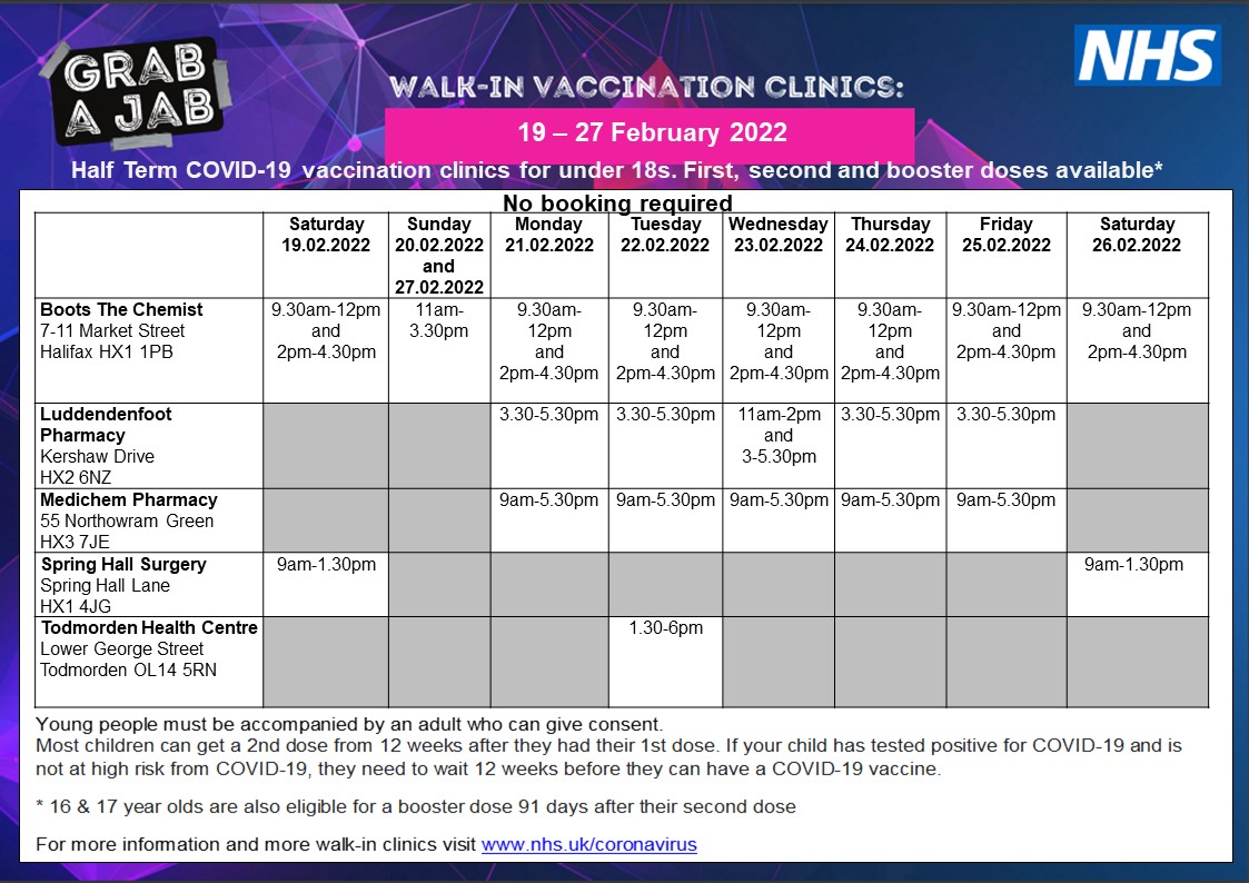 Walk in vaccination clinics will be available from 19 to 27 February for the under 18’s this half term.