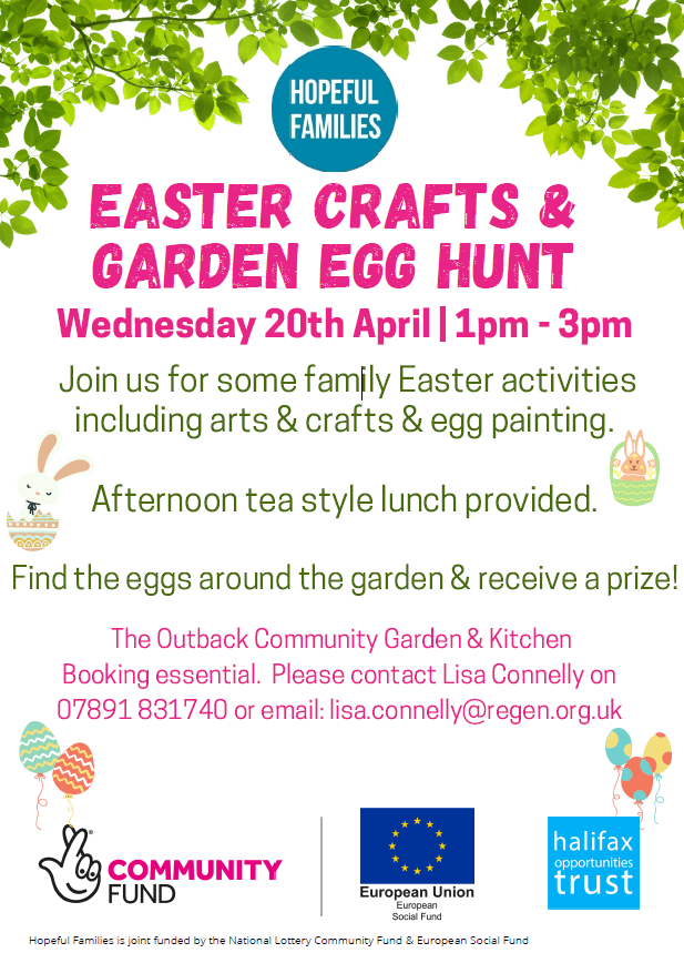Halifax Opportunities Trust is welcoming families and children to The Outback Community Kitchen & Garden on Wednesday 20 April from 1 pm till 3 pm for eggtastic activities including an egg hunt competition with the winner receiving a mysterious prize.