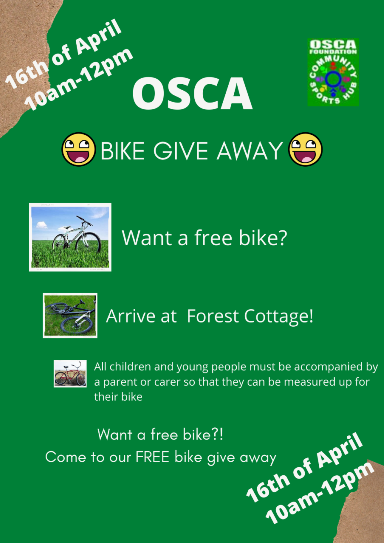 On Saturday 16th of April there will be a free bike giveaway at the OSCA Foundation at Forest Cottage from 10 am to 12 pm.