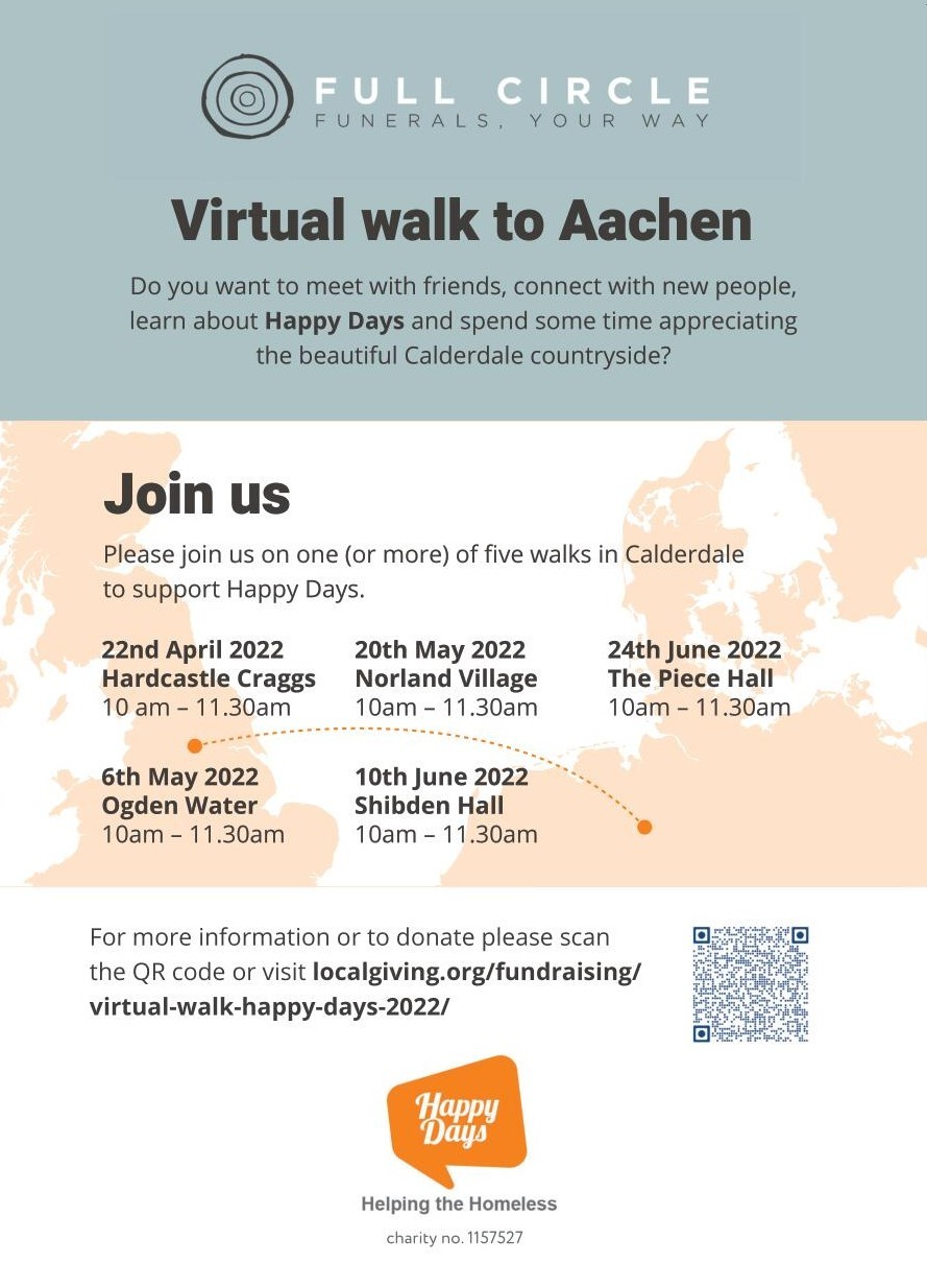 About FCF Virtual walk to Aachen – in Support of Happy Days Please join us on one of five walks in Calderdale to support Happy Days. Everyone is welcome and they are a opportunity to meet with friends, connect with new people, learn about Happy Days and spend some time appreciating the beautiful Calderdale countryside.