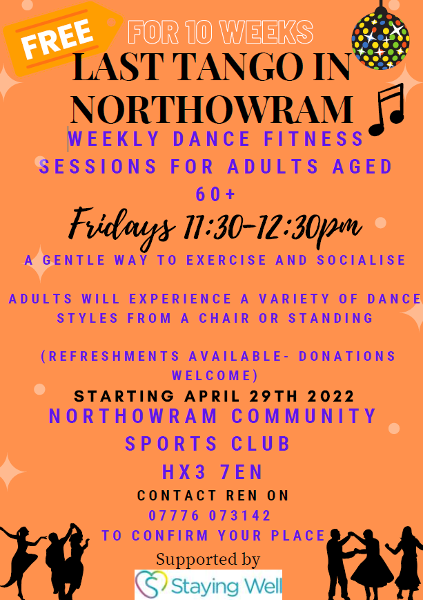 A new gentle dance and fitness class, supported by Staying Well, aimed at adults aged 60 and over starts in Northowram Community Club. This is a 10 week course, taking place every Friday from 11:30 – 12:30 and is free to attend.
