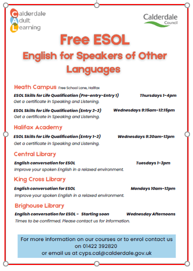English for Speakers of other Languages (ESOL) classes are available for free across Calderdale.