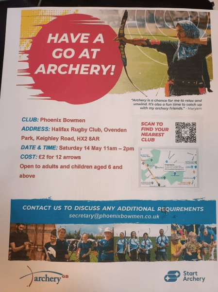 Halifax’s own Phoenix Bowmen, based at Halifax Rugby Club are holding an archery taster session on Saturday 14th of May between 11am and 2pm.