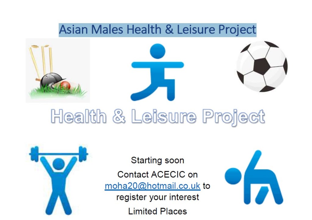 Asian Males Health & Leisure Project May 16, 2022 / helloitssarahdyer Starting soon…… Email moha20@hotmail.co.uk to register or for more information Share this: Click to share on Facebook (Opens in new window) Facebook Click to share on X (Opens in new window) X Click to email a link to a friend (Opens in new window) Email Click to print (Opens in new window) Print Click to share on Pinterest (Opens in new window) Pinterest Click to share on LinkedIn (Opens in new window) LinkedIn Click to share on WhatsApp (Opens in new window) WhatsApp Like Loading...