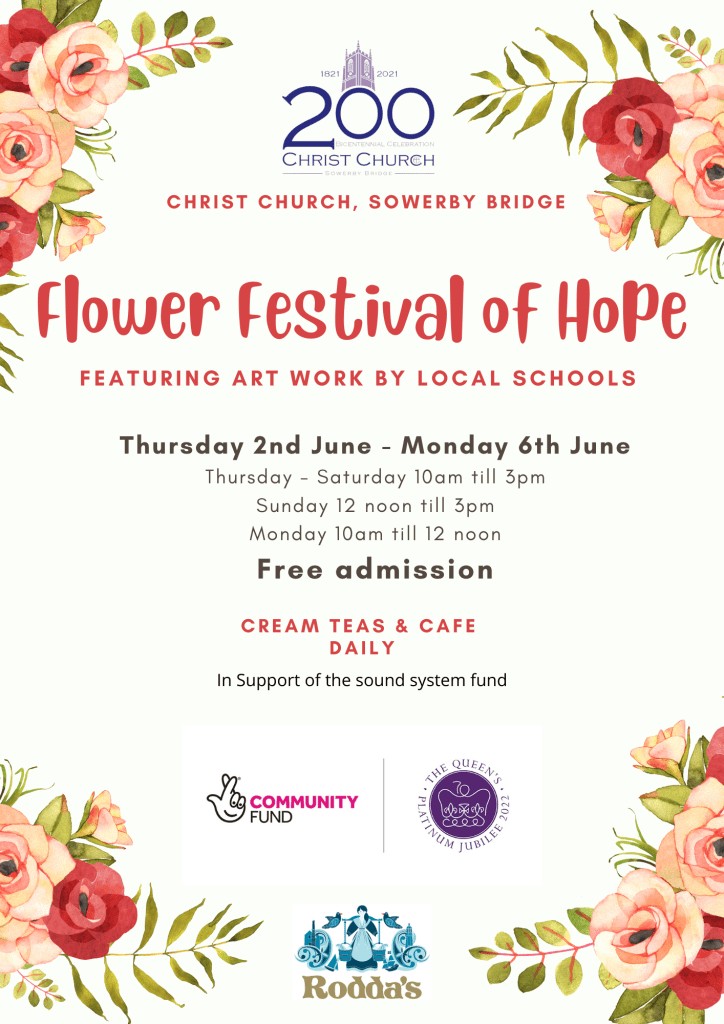 As our building celebrates its 200th anniversary we’re reflecting on the Queen’s reign and her links to groups and events in Sowerby Bridge’s past. See the talent in our community, using flowers, art and sculpture as together we look forward with hope to our town’s future.