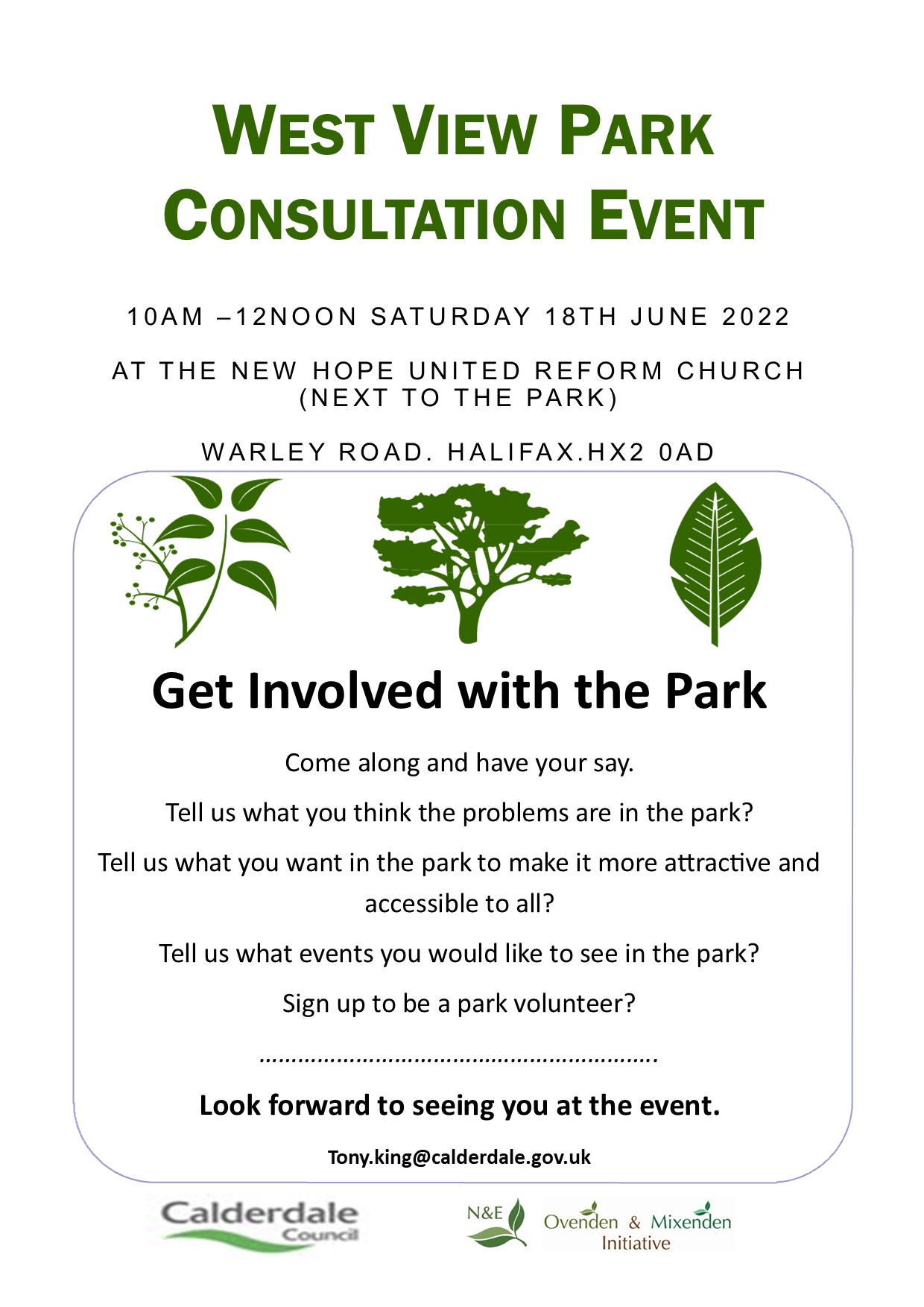 West View Park Consultation Event June 9, 2022 / helloitssarahdyer Get Involved with the Park Come along and have your say. For more info email Tony.King@calderdale.gov.uk Share this: Click to share on Facebook (Opens in new window) Facebook Click to share on X (Opens in new window) X Click to email a link to a friend (Opens in new window) Email Click to print (Opens in new window) Print Click to share on Pinterest (Opens in new window) Pinterest Click to share on LinkedIn (Opens in new window) LinkedIn Click to share on WhatsApp (Opens in new window) WhatsApp Like Loading...
