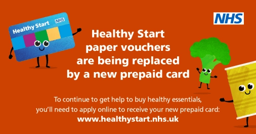 There is now an online application process with a prepaid card to be used for purchasing healthy food and milk, to replace the paper vouchers. You can also use the prepaid card to collect free NHS Healthy Start vitamins.
