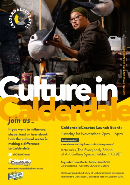 If you’re a creative professional, living in Calderdale come along to our series of networking events and/or training that will cover: Developing your freelance practice or creative business; health and wellbeing; financial resilience; educational achievement; sector specific training and career development; digital engagement; bringing communities together; events & festivals; tourism; making culture more accessible and affordable; play; living a larger creative life.