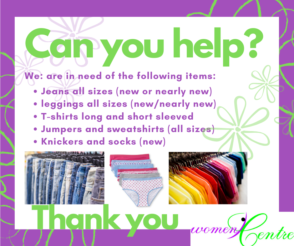 WomenCentre Halifax is short of a few clothing items at the moment. If you have any of the new or nearly new items listed in attached flyer please can you arrange drop off at the centre or give us a call on 01422 386500