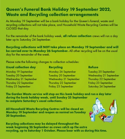 Waste and Recycling – refuse, recycling and garden waste are cancelled, Refuse waste scheduled for Monday 19 Sept will be collected on Tuesday 20 September and collections for these services will run a day late during this week.