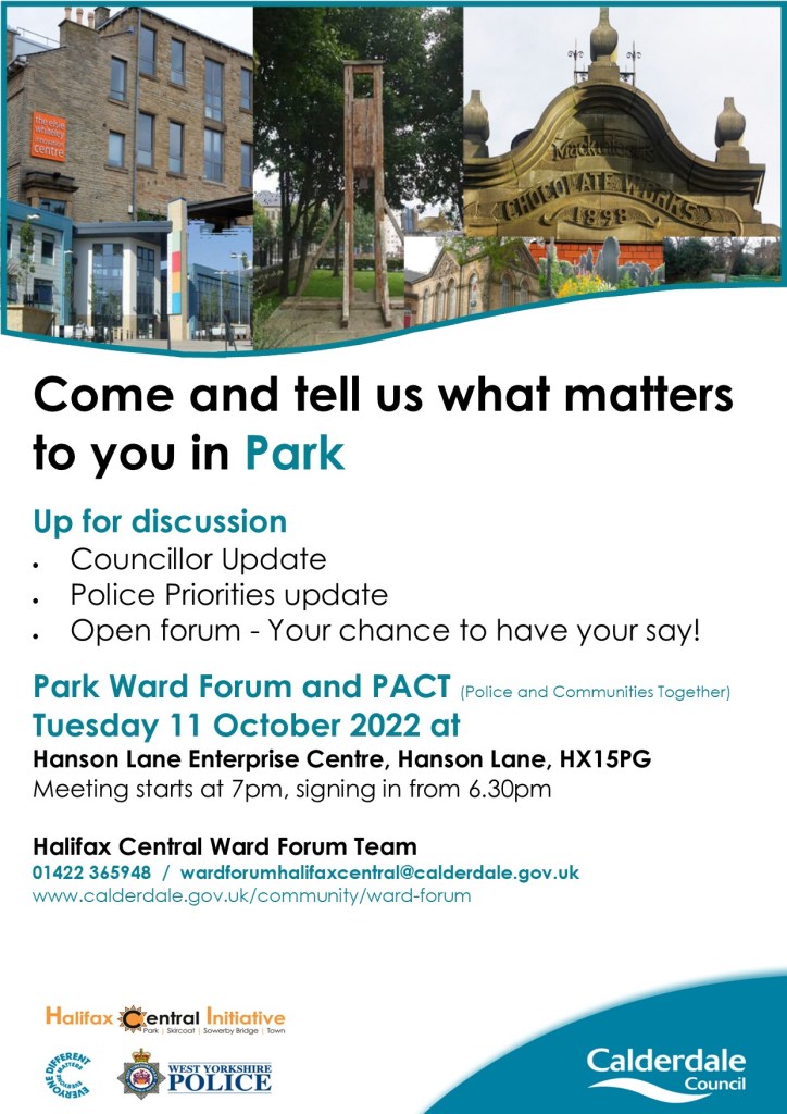 For more information email: wardforumhalifaxcentral@calderdale.gov.uk or Phone 01422 365948