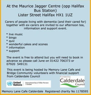 In conjunction with Bridge Community, we are hosting an afternoon tea, information and support event for unpaid carers of people living with dementia on Sunday 16th October at the Maurice Jagger Centre in Halifax.