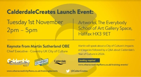 If you’re a creative professional, living in or working in Calderdale come along to the launch of the CalderdaleCreates network on Tuesday 1st November at Artworks The EveryBody School of Art 2pm – 5pm for the chance to network and shape the future of culture in the borough. Keynote Speaker Martin Sutherland OBE, CEO Coventry City of Culture 2021