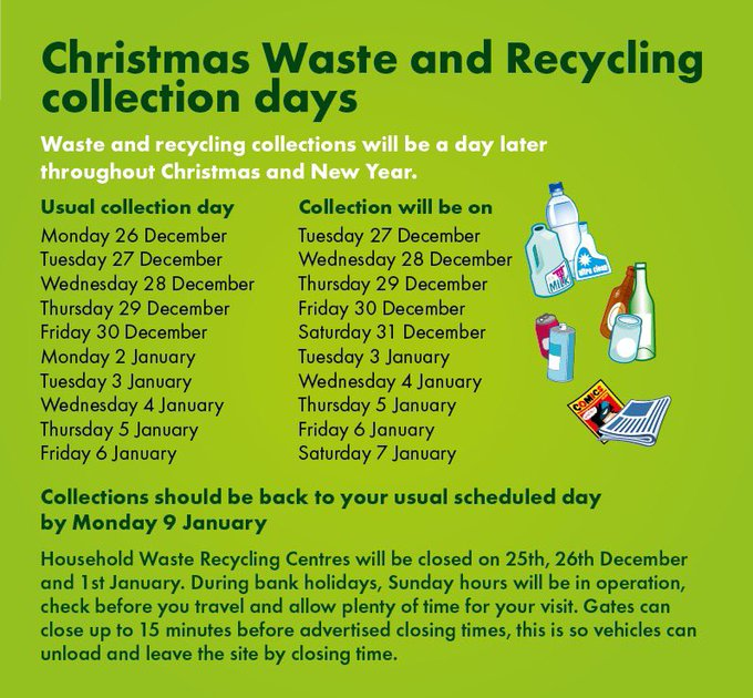 Christmas & New Year waste and recycling collections December 8, 2022 / helloitssarahdyer Your waste and recycling collection days will be a little different over Christmas. As usual, from Boxing Day ‘til 9th January, they’ll be a day later than scheduled. Here are all the changes. Save this on your phone as a reminder! Share this: Click to share on Facebook (Opens in new window) Facebook Click to share on X (Opens in new window) X Click to email a link to a friend (Opens in new window) Email Click to print (Opens in new window) Print Click to share on Pinterest (Opens in new window) Pinterest Click to share on LinkedIn (Opens in new window) LinkedIn Click to share on WhatsApp (Opens in new window) WhatsApp Like Loading...
