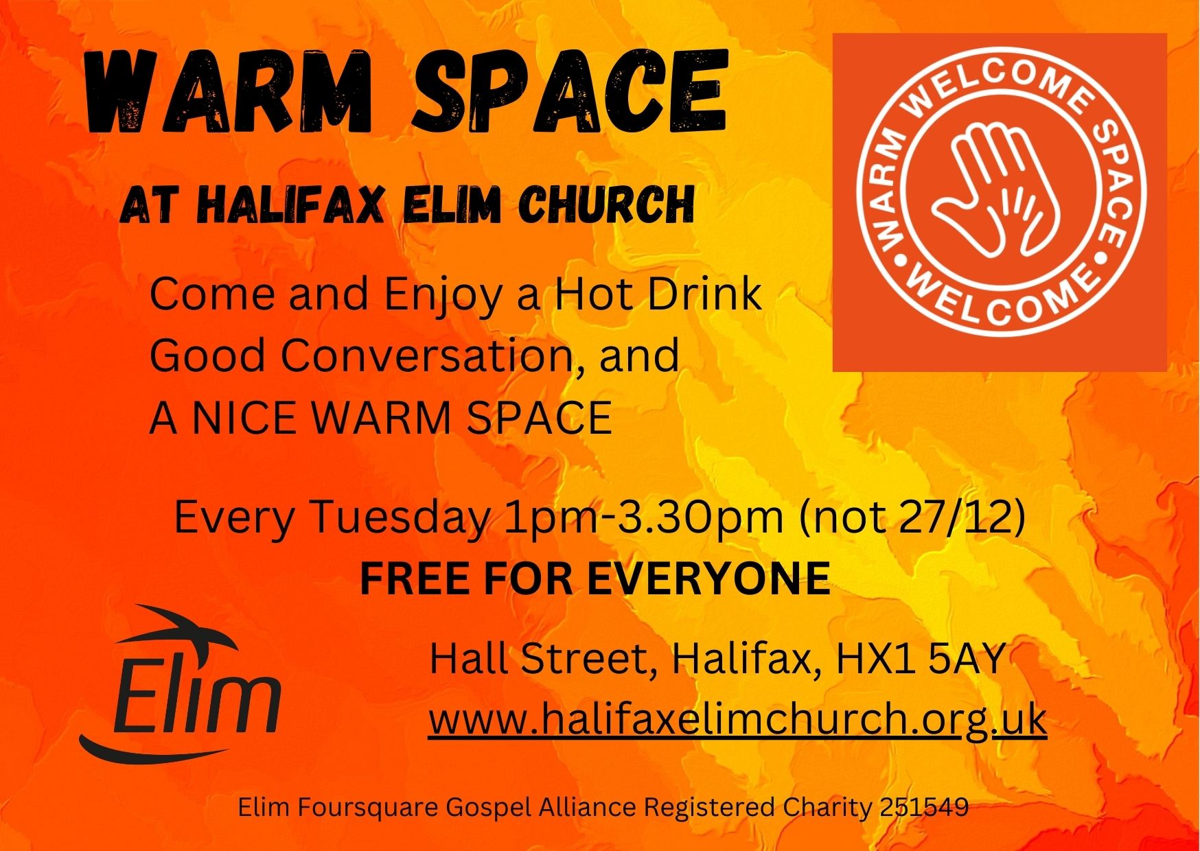 Halifax Elim Church are delighted to be opening a Warm Space at their church building Every Tuesday (except 27th Dec) 1pm – 3.30pm.