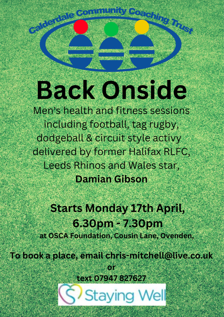 Say hello to a new Staying Well funded activity for men aimed to help them improve their physical and mental wellbeing. It is a 10 week programme run at OSCA Foundation, which includes football, tag rugby, dodgeball and circuit style activities. The sessions are delivered by Damian Gibson – a former Halifax RLFC, Leeds Rhinos and Wales superstar! For more information contact chris-mitchell@live.co.uk or text on 07947827627.