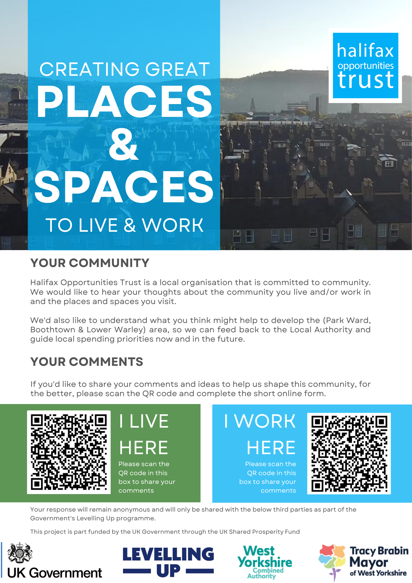 Creating Great Spaces & Great Places May 9, 2023 / helloitssarahdyer Do you live and/or work in Park Ward, Pellon or Boothtown? Then please complete our questionnaire to help shape local spending priorities in your community’ Share this: Click to share on Facebook (Opens in new window) Facebook Click to share on X (Opens in new window) X Click to email a link to a friend (Opens in new window) Email Click to print (Opens in new window) Print Click to share on Pinterest (Opens in new window) Pinterest Click to share on LinkedIn (Opens in new window) LinkedIn Click to share on WhatsApp (Opens in new window) WhatsApp Like Loading...