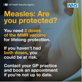 Although we are unaware of any confirmed measles cases in Calderdale, it’s a timely reminder for people to check they and their children have had two doses of the MMR vaccine, and to be aware of the symptoms of measles. The free MMR vaccine is a safe and effective way of protecting ourselves and children against measles, as well as mumps and rubella, and can help stop outbreaks occurring in our communities.