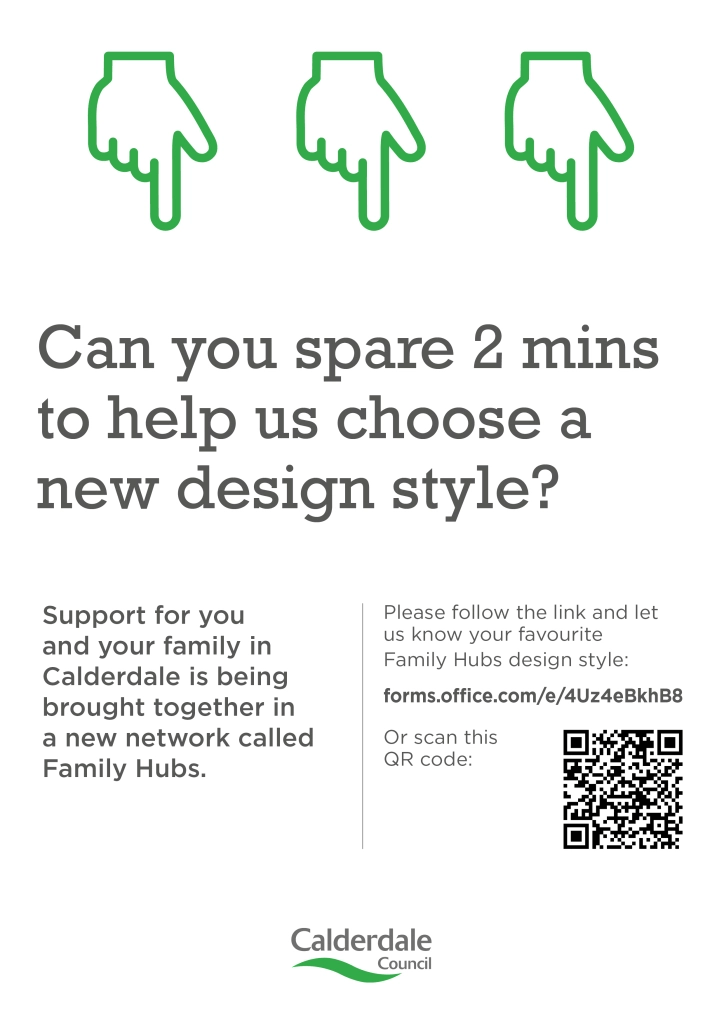Family Hubs are being developed with you, the families and young people of Calderdale so we would like your feedback on two design ideas. Can you spare 2 mins to help us?
