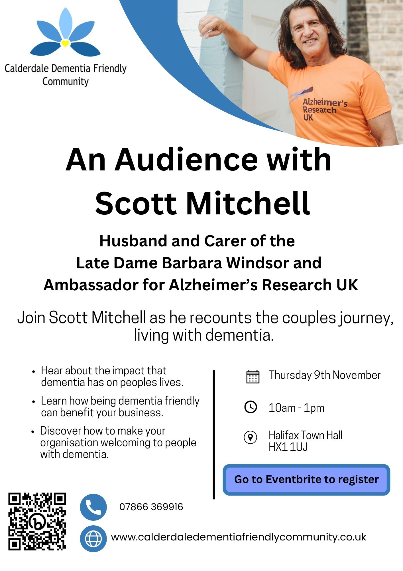 Calderdale Dementia Friendly Community (CDFC) is inviting Calderdale businesses, charities, community groups and churches to come along to Halifax Town Hall on Thursday 9th November to learn more about dementia. You’ll hear from a high-profile key speaker about the personal impact of dementia and what we can all do to support people affected by dementia.